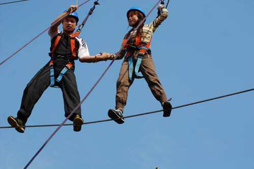 项目简介: 学员两人一组手牵手合作从钢丝的起点走到对面终点。 项目意义: 体验小团队合作,强化学员须要不断进取、勇于探索的精神,同时明白不管我们的目标有多么的遥远,路途有多么的艰辛,相信自己、相信同伴,我们一定会成功,相信自己、相信团队。