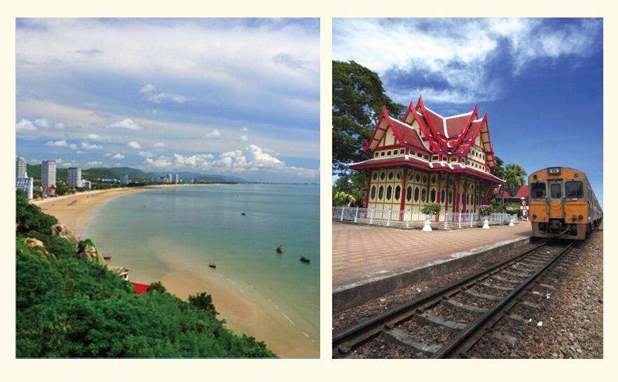 华欣位于曼谷南部281公里,到华欣可以坐汽车、火车甚至坐飞机去,不过最吸引人的应该是坐火车去,因为那里的火车站是全泰国最古老、最有名、最漂亮的火车站。火车站建于拉玛六世时期,拥有独一无二的泰式建筑风格的皇室人员候车室。候车室是在拉玛六世时从Nakhon Pathom府的Sanam Chan宫搬过来的,当年拉玛六世就是在这里候车离开华欣回曼谷的。