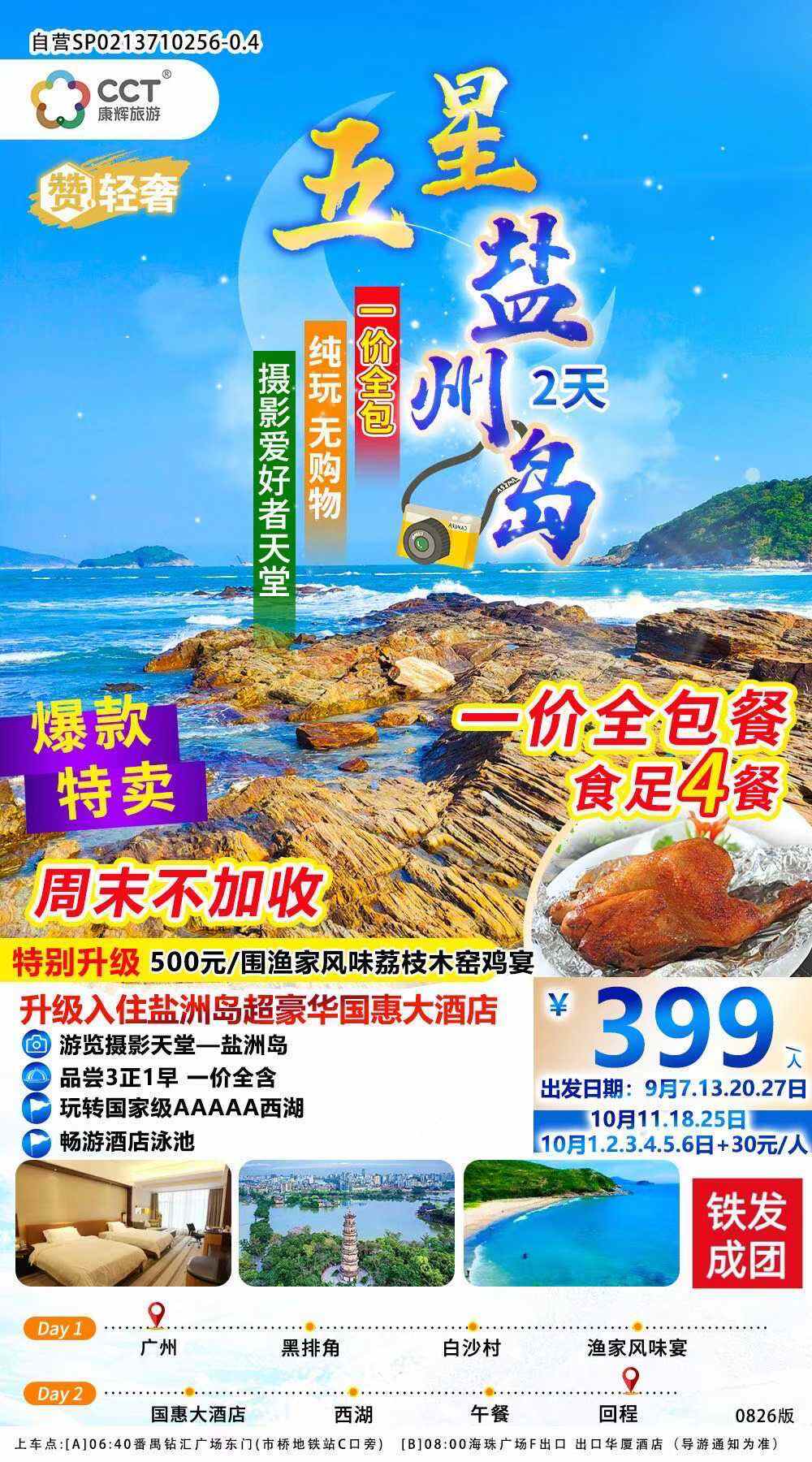 自营<赞.深度盐洲岛>广州往返惠州 一价全包 吃足4餐 盐洲岛住超国惠大酒店2天