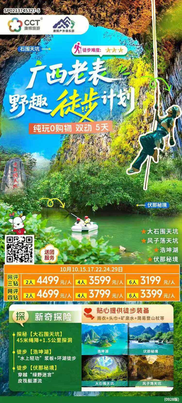 网评三钻2人4499元/人4人3599元/人6人3199元/人网评四钻2人4699元/人4人3799元/63399元/人探新奇探险贴心提供徒步装备雨衣+头巾+矿泉水+简易登山杖等
