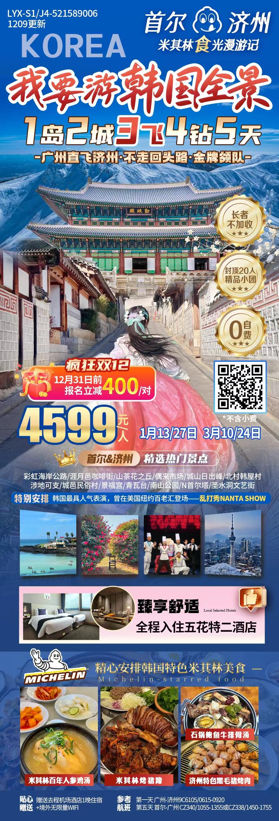 广州往返,家门口出发,直飞济州岛,五天三飞行程,不走回头路