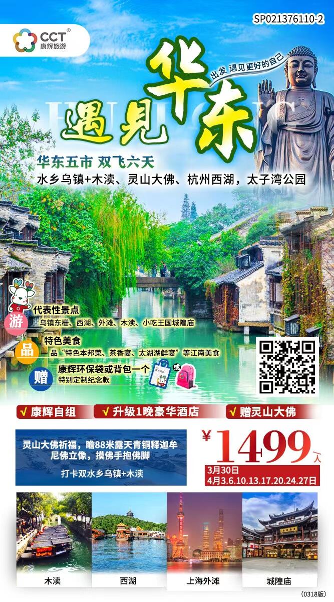 广州往返华东五市,水乡乌镇+木渎、灵山大佛,杭州西湖、中山陵、上海外滩6天跟团游
