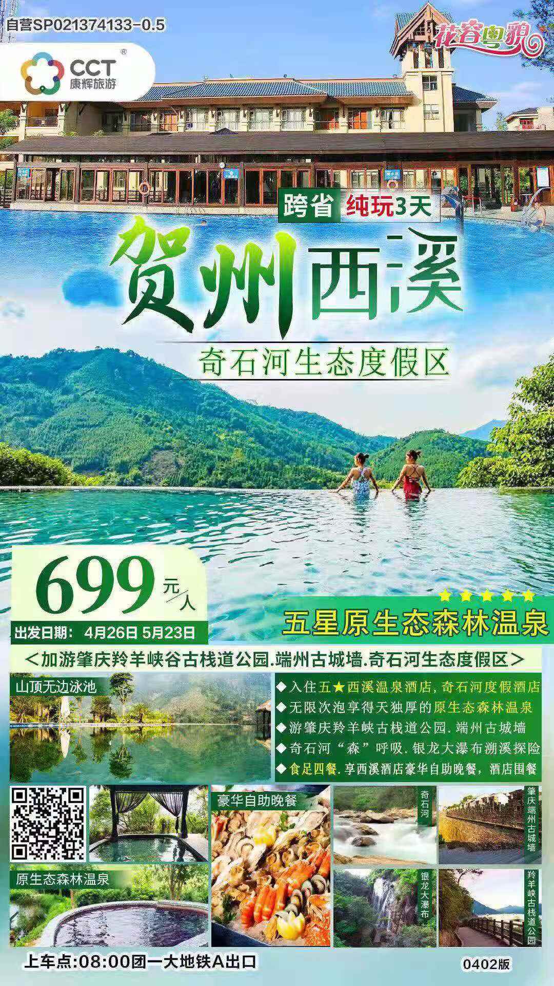 早餐:× 午餐:× 晚餐:√ 住宿:√入住贺州西溪温泉酒店精品双/精品观景双/豪华双,随机不指定(仅有少量三人房,如有需要请提前咨询。单人需补房差)