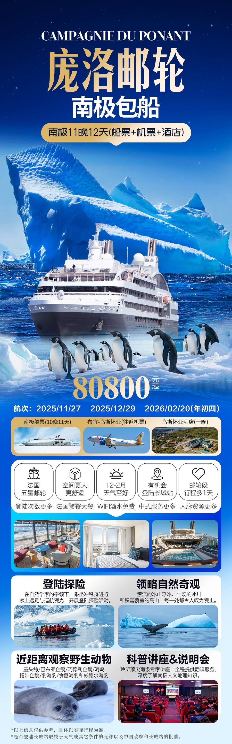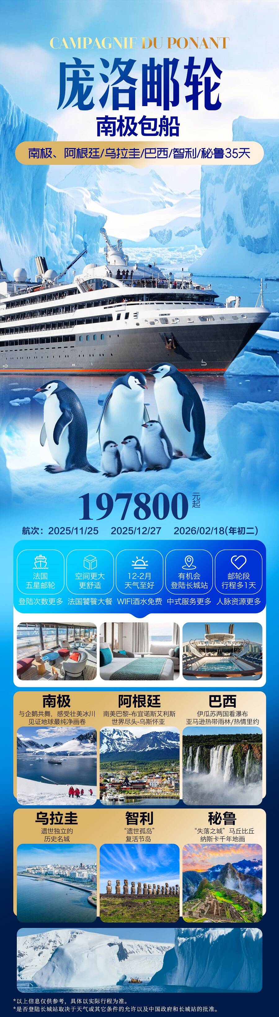 梦幻南极,触手可及!乘坐五星法国庞洛邮轮,让梦想扬帆远航。